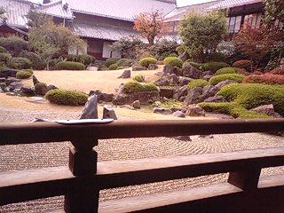 湯屋方丈の縁側から、庭を眺めたところ この写真を撮った後、庭をキジ柄の飼いネコが横切ってました どこかのお姉さんが「おいで」と声をかけると、ぴょーんと飛び上がってきてました。